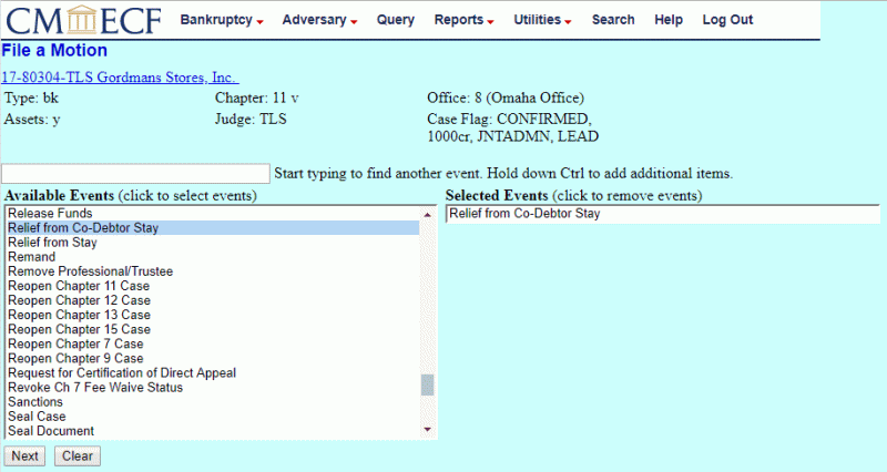 Click on the desired event "Relief from Co-Debtor Stay" to select it from the list. (See Figure below)